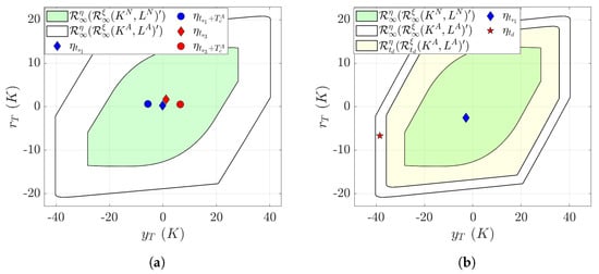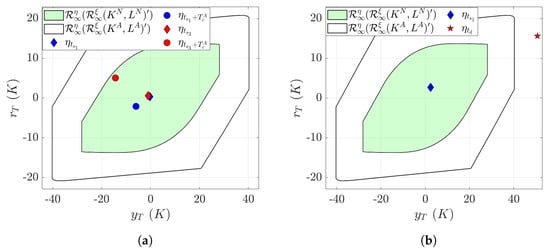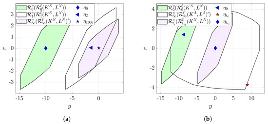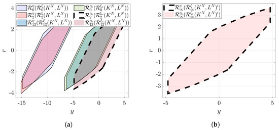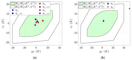 where the subscript “a” to the variable (e.g., , , and ) indicates the presence of an attack. The minimum invariant set of the attacked closed-loop process with stable in the sense that , may be expressed (similar to Equation (7)) as: