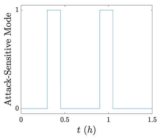 Per the steps in Algorithms 1 and 2, the odd switching instances, which dictate when a switch from the nominal control mode to attack-sensitive control mode occurs, may be chosen as an arbitrarily large positive integer. To avoid waiting for an inordinately long time period before a control mode switch, the time step for odd switching instances may be chosen as an integer over a finite time interval , where is the lower bound and is the operator-specified upper bound of the interval.