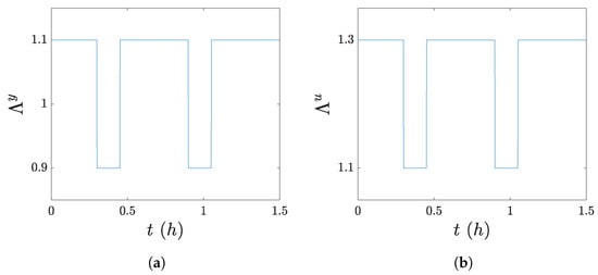 Consider the attack-free closed-loop process operated under the nominal control mode with the set of initial states . Before a switch to the attack-sensitive control mode occurs, the reachable set-based detection scheme in Equation (18) accounts for all values of the attack-free process and generates no false alarms. Consider the switch to the attack-sensitive control mode at the randomly chosen time step , followed by another switch back to the nominal control mode at the randomly chosen time step . From Equation (18), the reachable set-based detection scheme switches to monitoring the process based on the attack-free reachable sets computed for the attack-free process operated under the attack-sensitive mode, i.e., for all . For the attack-free process operated under the attack-sensitive control mode, its reachable set at each time step after the switch contains all values of the monitoring variable (), leading to an output of 0 for . Similarly, after switching back to the nominal control mode at time step , the reachable set-based detection scheme generates no false alarms. Similarly, for all subsequent switches between the nominal and the attack-sensitive control modes implemented on the process at randomly chosen time steps, it can be demonstrated that the detection scheme in Equation (18) generates no alarms. □