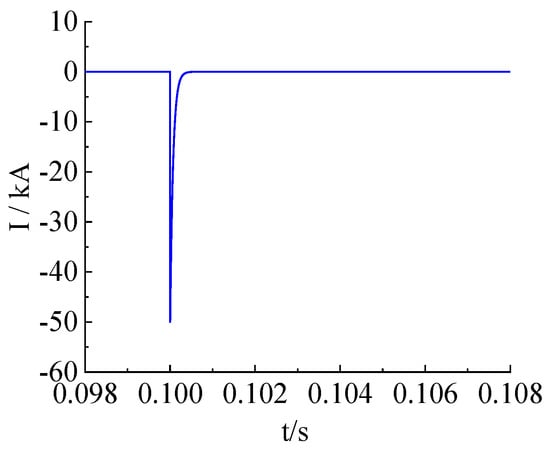 The empirical data indicate that a substantial proportion, ranging from 70% to 90%, of natural lightning carries a negative charge. Therefore, a 1.2/50 μs negative polarity double exponential lightning current model is employed for analysis []. Equation (1) represents the calculation for the lightning current, while its waveform is illustrated in Figure 2.