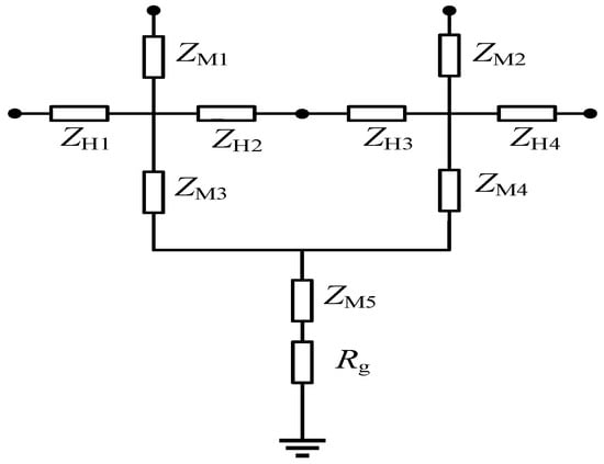 Various simulation models for transmission towers are commonly used, including the standard model, inductive model, and wave impedance model. The standard model does not account for the phenomenon of overvoltage change, while the inductive model overlooks the influence of the tower on the lightning current wave []. This study employs a multi-wave impedance model derived from Bergeron to replicate the behavior of 220 kV cup-type iron towers. The model accurately reproduces the refraction and reflection of lightning current waves on the tower, as depicted in Figure 4. In this context, ZH denotes the transverse carrier wave impedance, ZM denotes the main brace wave impedance of the tower, and Rg represents the grounding resistance.