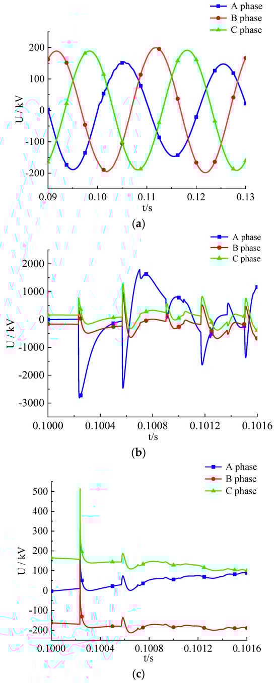 - In Figure 6b,c, the voltage amplitude of winding strike faults exceeds that of counterstrike faults for the lightning current in Figure 2. Specifically, the first wavefront voltage amplitudes reach approximately 2800 kV and 500 kV, respectively, and both exhibit steep shapes. When lightning bypasses lightning rods and poles and directly strikes the phase A conductor, the polarity of its voltage traveling wave is opposite to that of the other two phases. When the lightning rod or pole is directly struck by lightning, the transient voltage traveling wave polarities of all three phases are identical.