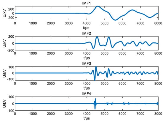 When the lightning strike occurs near the C end, there is a high detected transient energy ratio of the high-frequency component. Conversely, when the lightning strike is near the D end, the detected transient energy ratio of the high-frequency component is low, and vice versa. In light of the unpredictable characteristics of lightning strikes on overhead lines, calculating the combined energy ratios from both ends is necessary to mitigate the influence of the strike distance on the transient energy ratio of high-frequency components. The zero-mode voltage at both ends of the line is extracted and then subjected to KL-VMD decomposition, as depicted in Figure 7. In Figure 7, IMF1 represents the first intrinsic mode component of zero-mode voltage decomposed by KL-VMD; IMF2 represents the second intrinsic mode component of zero-mode voltage decomposed by KL-VMD; IMF3, IMF4, and so on.
