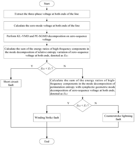 The data presented in Table 2 indicate disparities in the EK2 values between winding strike faults and counterstrike faults. The EK2 values for winding strike faults are consistently below 0.08, whereas the EK2 values for counterstrike faults consistently exceed 0.08. Consequently, a threshold of EK2 = 0.08 has been established for differentiation. The flowchart illustrating the lightning fault identification criterion can be observed in Figure 8.
