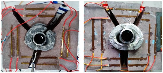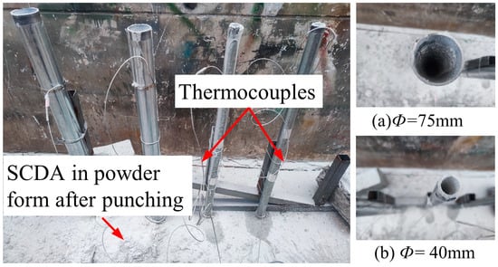 According to Equation (1), 1 mol of water fully reacts with 1 mol of calcium oxide in a mass ratio of 0.32, releasing 64.9 kJ of heat. The content of CaO in commonly used SCDA is about 80%, and the heat released by 1 kg of SCDA is 928.1 kJ, allowing 2.8 kg of water to be heated from 20 °C to 100 °C. Higher temperatures vaporize the free water in the slurry to produce steam pressure. When the steam pressure exceeds the expansion pressure of the SCDA and the friction in the borehole, the energy is released instantly along the borehole axis, accompanied by a large amount of slurry and water vapor ejection. Figure 1 shows the state of spraying holes in the steel pipe after 1–2 h of slurry injection. The length of the steel pipe is 1000 mm, and the inner diameters are 40 mm and 75 mm. The SCDA is type II, applicable to the ambient temperature of 10–30 °C. The water/cement ratio is 0.34, the test ambient temperature is 20 ± 2 °C, and the armored thermocouple is within the range of 0–500 °C.