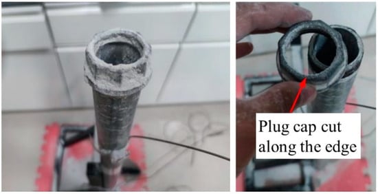 To prevent the development of blowholes, some scholars proposed to seal the orifices by machining flanges or plugs on the steel pipe ports, as shown in Figure 2. The inner diameter of the steel pipe is 40 mm, and its length is 1000 mm. Armored thermocouples with a range of 0–500 °C are used, and the slurry is injected and sealed with a threaded plug cap.