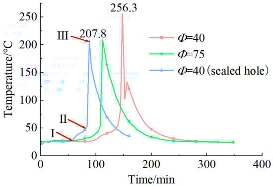 As shown in Figure 3, the tube diameter and sealing conditions affect the reaction rate and temperature of the SCDA. The temperature change curve can be generally divided into three stages based on the increasing trend of temperature. Stage I: Initial condensation after filling with the SCDA (at about 1.5 h), with the tube temperature matching the ambient temperature. Stage II: The initial condensation state is transformed into the final condensation state, followed by expansion. Expansion pressure and friction are generated in the steel pipe, causing heat accumulation inside the steel pipe and accelerating the hydration reaction process. Stage III: The energy imbalance state, where heat vaporizes the water in the free state to form vapor pressure. When the vapor pressure exceeds the expansion pressure and pipe wall friction, the water-hardening material blocks the heat dissipation channel, the equilibrium state is disturbed, and heat and water vapor carrying a large amount of the SCDA is ejected from the borehole. It was found that the sealed boreholes with an inner diameter of 40 mm and the unsealed ones with a 75 mm inner diameter had lower punching temperatures and required less time for a reaction to occur. In contrast, the unsealed boreholes (inner diameter = 40 mm) exhibited a relatively high punching temperature, resulting in elongated time. The reason for this is that a sealed environment enhances vapor pressure, resulting in a reduction in the hydration reaction time and temperature. In the case of the 75 mm inner diameter, the increase in the borehole diameter improves steam discharge and promotes the hydration reaction, elevating the vapor pressure rapidly. It can be inferred that a larger-diameter borehole is easier to punch. Conversely, vapor pressure accumulation is challenging for unsealed holes with an inner diameter of 40 mm. As a result, the hydration reaction time is longer, and the required punching temperature is higher.