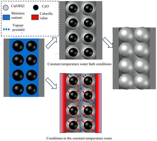 The use of soundless chemical demolition agents (SCDAs) for rock breaking or demolition operations has the advantages of low engineering interference, producing no noise, no fire, and no toxic and harmful gases. SCDAs can be widely applied in densely populated urban demolition [1,2,3,4], protective demolition [5], coal rock crushing in mines, and other fields [6,7,8,9,10]. In addition, applying these agents can decrease the large quantity of explosives required, aiding environmental protection and engineering safety; also, it increases reservoir permeability, promoting the development of oil and gas resources [11,12,13]. However, the high temperatures and blowholes generated by the hydration reaction have limited the use and development of SCDAs. Calcium oxide (CaO) is the main ingredient of SCDAs (with a content of about 80–95%) [14,15,16], which generates a large amount of heat during the hydration reaction. If excessive heat is accumulated in the slurry and not released in time, it can easily cause violent reactions during the test, damaging the strain gauges or creating blowholes. In field applications, the emergence of boreholes affects the safety of the operators and leads to a decrease in expansion performance or even complete failure. Therefore, failure of the expansion pressure test due to high-temperature burning of the strain gauges or holes should be avoided. The “Chinese SCDA Expansion Pressure Test Standard” specifies that the test pipe should be submerged in a constant-temperature water tank for testing [17]. The high thermal conductivity of steel and the large specific heat capacity of water can be used to absorb the heat released by the hydration reaction, thus obtaining the expansion stress throughout the reaction process. The main mechanism of this reaction occurs when high temperature and vapor pressure cannot be formed under a favorable heat dissipation environment, which delays the hydration reaction of SCDAs. However, the expansion time and pressures in engineering field applications differ from those under the test environment, and the flooded engineering conditions can hardly be achieved.