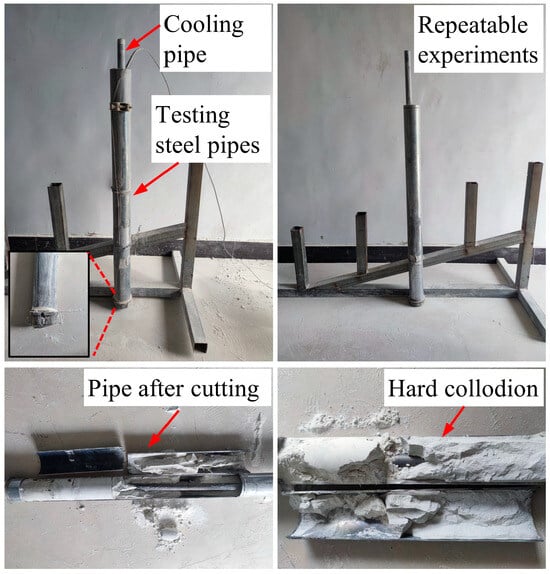 After fixing the steel pipe, one end of the cooling pipe was blocked and placed in the test steel pipe. Water was added to the cooling pipe until it was flush with the upper surface of the steel pipe. Subsequently, the slurry was prepared with a water/cement ratio of 0.34 and poured into the steel pipe to await the hydration reaction. Figure 5 shows the results of the blowhole prevention test.