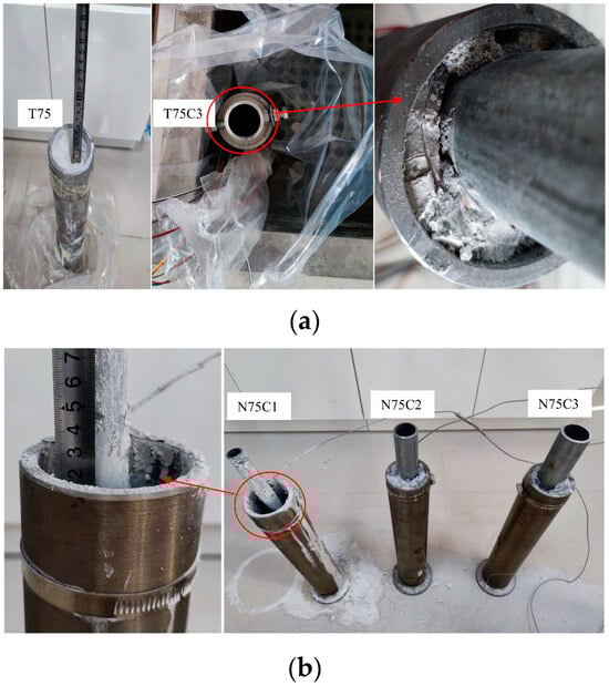 As shown in Figure 7a, in a constant-temperature water bath, the heat generated from the hydration reaction of the SCDA slurry is rapidly absorbed by the peripheral water of the steel pipe, and no punching in the hole occurs during the test. The expansion of SCDA is dominated by the circumferential expansion. At the mouth of the hole, due to constraints and the reduced friction force, the SCDA appears in the form of powder and a small amount of overflow with a height of 3–5 cm, and the inside of the drilled hole is a hard colloid. Figure 7b displays the blowout prevention effect of the ICBPM. A small amount of slurry and hot water splashed at the borehole entrance during the N75C1 test, indicating the highly intense hydration reaction inside the borehole. In addition to the phenomenon at the orifice, the remaining SCDA in the borehole is still a tightly extruded hard colloid. In this sense, the cooling pipe exerts a good effect in preventing blowout, and the slurry in the borehole retains a strong expansion capacity. The blowout prevention effect of the C2 and C3 cooling pipes is better than that of the C1 pipe since no blowhole and cooling water splash occurred during the experiment, and a hard collodion was formed inside the borehole. According to Figure 7, the slurry inside the borehole under both experimental conditions is extruded, dense, and hard collodion, indicating that the internal cooling method has a significant blowout prevention effect. In addition, this effect is related to the cooling pipe and a larger cooling pipe diameter embraces a greater amount of cooling water that lowers the content of the slurry, thus improving the blowout prevention effect.
