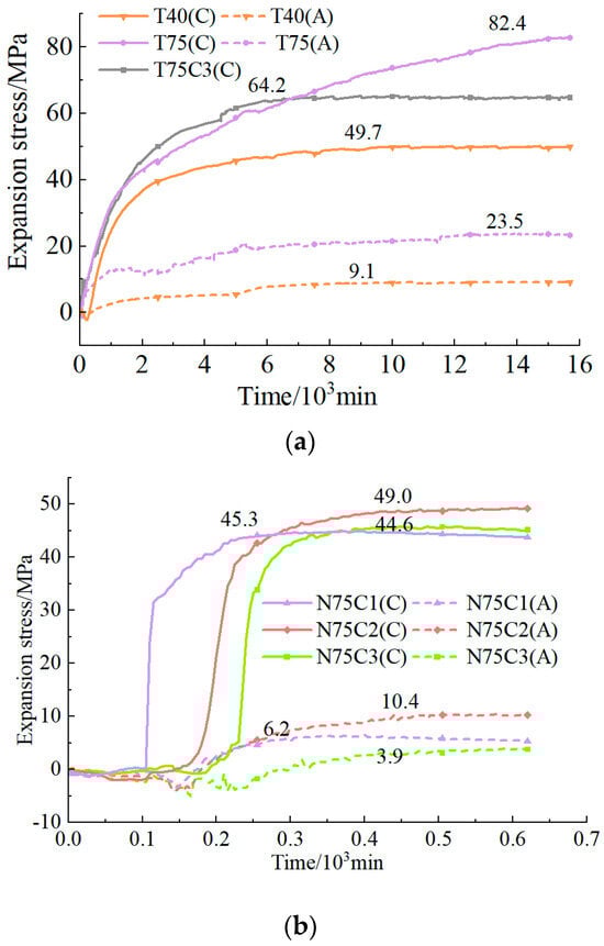 Expansion performance parameters. (a) Expansion stress in constant-temperature water bath. (b) Expansion stress of ICBPM.