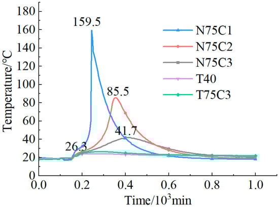 The temperature increase of the slurry inside the borehole in a thermostatic water bath is small, with the maximum temperature increasing to 26.3 °C, and the dosage increment exerts a limited effect on the temperature. The temperature of the borehole is consistent with that set by the water tank. In addition, the temperature increase is much lower than the vaporization temperature, suggesting that no punching occurs throughout the test. Compared with the temperature in the constant-temperature water bath, the temperature of the ICBPM rises significantly. This is because the amount of cooling water is low, the absorption of heat is limited, and heat accumulation continues to occur in the borehole. Additionally, the volume of cooling water contributes to the time of temperature variation. N75C1 exhibits an abrupt increase in temperature, with an obvious inflection point; the highest temperature is achieved with the least heat growth time, which is consistent with the characteristics of the expansion pressure curve in Figure 8b. With the increasing diameter of the cooling pipe and the decreasing slurry content, the temperature increment inside the borehole drops gradually, and the curve becomes smooth, indicating a favorable hydration reaction inside the borehole.