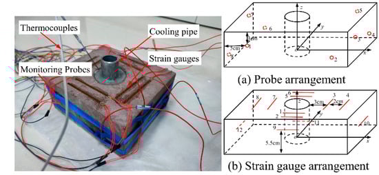 With the center point of the specimen’s bottom surface as the origin, the acoustic emission probes were arranged on the diagonal lines on four side surfaces (xoz and yoz). The x, y, and z boundary directions were each moved inward by 5, 5, and 3 cm, respectively. In addition, vaseline was applied between the transducer and the specimen as a coupling agent, and adhesive tapes were used to fix the transducer. The strain gauges of the xoy plane were placed with the center of the surface as the base point. The strain gauges were pasted along the x and y directions, with a distance of 3 and 5 cm from the boundary of the borehole to the outward directions, and lateral strain gauges were arranged in the center of the plane. Thermocouples were inserted inside the slurry to record the slurry reaction temperature. After arranging the equipment, the slurry was injected into the hole at a water/cement ratio of 0.34, and water was poured into the cooling pipe following a water injection coefficient of 0.14. Then, the expansion was observed.