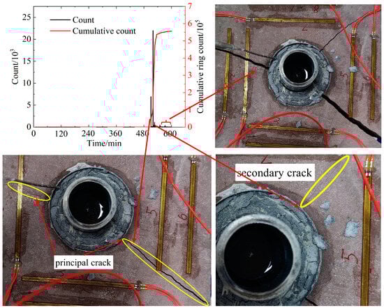 This paper explored the loading method of the SCDA, including a lengthy process of a hydration reaction and gradual expansion. Due to the hard rock materials, monitoring the acoustic emission signal from the compaction to the destruction stage is challenging. With energy accumulating within the borehole, the rock suddenly collapses, significantly increasing the acoustic signals. Given that the loading was performed within the borehole, and no constraints were applied on the outer boundary, no compression or misalignment was detected between the rock mass and the block after destruction. As a result, the generation of acoustic emission signals after rock damage was quite limited. The detectable signals originate from the rupture of primary cracks and the growth of secondary cracks. As seen in Figure 11, the ringing signals exhibit the same traits as crack formation. Before damage, the ringing count exhibits almost no acoustic signals; substantial acoustic signals suddenly appear during damage, with minor fluctuations thereafter. The acoustic emission data align with the sequence of rock fracture, primary crack, and secondary crack formation in the image. The test outcomes indicate that acoustic emission is an accurate indicator of rock fracture characteristics when exposed to SCDA expansion.