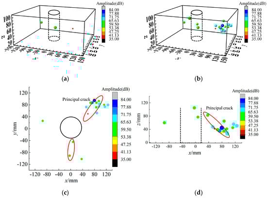 Acoustic emission localization characteristics. (a) Event locus 1 min before macro rupture. (b) Macro fracture event locators. (c) Top view of event locations. (d) Main view of event locations.