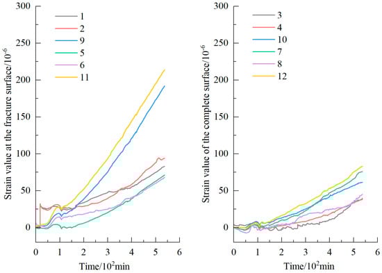 Strain gauges were placed randomly to monitor rock deformation and crack expansion. In this paper, strain gauges with long grids were arranged closely along the periphery of the borehole. Using strain gauges can intuitively reflect the expansion of the SCDA and rock deformation, and the strain monitoring data are shown in Figure 13.