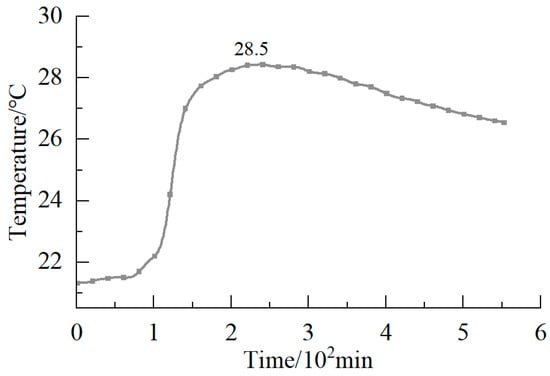 As shown in Figure 15, the temperature profile of the SCDA reveals the development of expansion stress. The temperature rise time is consistent with the tested results in the steel pipe, indicating a consistency in the initial solidification time of the SCDA under the same ambient temperature conditions. The dosage change has few effects on the curing time of the SCDA, ensuring abundant construction time. Under the same condition of water injection, the temperature inside the specimen is significantly reduced compared to that inside the steel pipe. This is mainly due to the test condition of the steel pipe, where the outside of the steel pipe is air. Notably, the air is recognized as a poor heat conductor, possessing a thermal conductivity coefficient of 0.01–0.04 W/m·K and a specific heat capacity of 1003 J/ kg·K. In contrast, the coefficient of thermal conductivity and the specific heat capacity of the rock are 2–6 W/m·K and 700–1000 J/ kg·K, respectively [34,35]. Air exhibits a poorer ability to absorb and transfer heat than the rock, thus leading to a better heat insulation effect and less heat dissipation. As a result, the test temperature of the SCDA in the rock is further reduced.