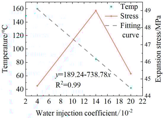 However, in the actual working environment, the heat generated from the hydration reaction significantly impacts the expansion performance and crushing effect. When using the ICBPM to test the expansion stress, the change in the cooling pipe diameter affects the water injection volume and slurry content. In this paper, the water injection coefficient was considered to reveal the relationship among the water injection volume, slurry content, reaction temperature, and expansion stress, and it is shown in Equation (9) as follows:
