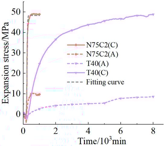 It can be seen that the expansion stress is consistent with the two borehole diameters in both test environments, with the resulting radial expansion stress and axial stress reaching about 49 MPa and 10 MPa, respectively. The reason for this is that the heat dissipation conditions are optimized in the tank environment, achieving consistent expansion stress with that of the 40 mm borehole diameter. In the water bath, the slurry expands slowly, the reaction is more thorough, and the expansion stress curve is smoother. However, the test time is too long, and the results do not meet the expected standards. Compared with T40, N75C2 shows a steep increase in the expansion stress curve. This rise is attributed to the heat released from the hydration reaction accelerating the expansion reaction with the employment of the internal cooling method; as a result, the expansion reaction time is reduced dramatically.