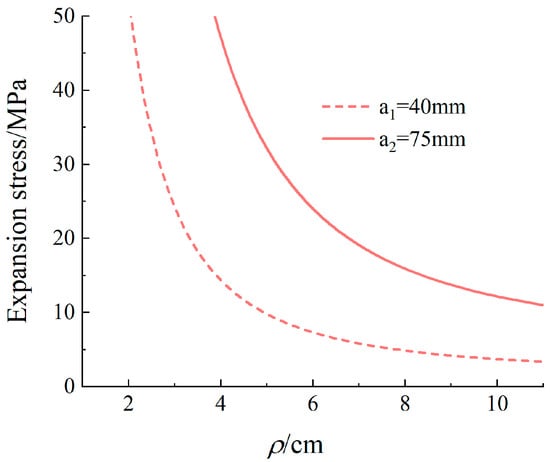 It can be observed that the stress state at an internal block point decreases nonlinearly with the increasing distance to the borehole’s center. This decreasing trend is consistent for different borehole diameters due to the power function of variations in tensile stress within the test block with ρ. It is also noted that the tensile stresses applied inside the block show significant differences depending on the diameters of the hole. To further analyze the effect of the diameter of a borehole on rock-crushing performance, Equation (12) shows the effect of an enlarged pore size on the expansion properties under the same boundary conditions.