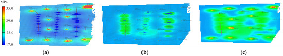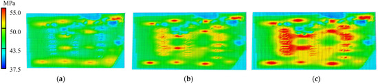 Changes in reservoir stress field (a) after long-term water injection; (b) after the pre-fracturing energy replenishment; (c) after the integration of fracturing flooding (model parameters: porosity of 9%, permeability of 0.3 mD, original formation pressure of 15.6 MPa, reservoir thickness of 20 m, and plane grid size of 40 m. Stress boundary conditions: maximum horizontal principal stress 42 MPa, minimum horizontal principal stress 36.8 MPa, and vertical principal stress 55 MPa).