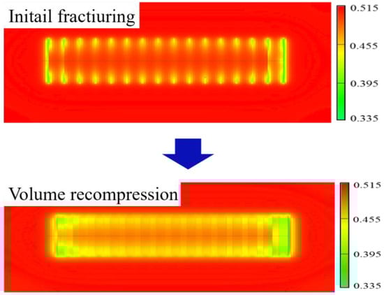 The variations in fracture-controlled reserves associated with different fracture networks after initial fracturing and volumetric recompression of horizontal wells are analyzed by numerical simulation methods [20]. The results demonstrated that the initial fractured wells controlled limited reserves. However, after volume recompression, the coverage of fractures to interwell and interfracture reserves increased significantly. Consequently, the single-well fracture-controlled reserves were enhanced from 36,000 to 172,000 tons (Figure 4).