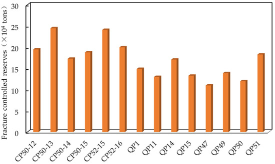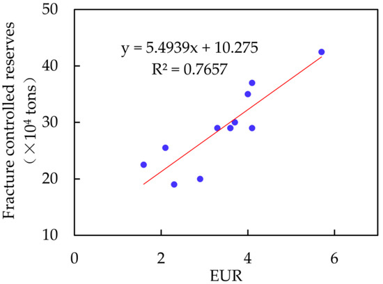 The estimated ultimate recovery (EUR) after the volumetric fracturing of 11 horizontal wells in the Yuan 284 block was calculated by combining the methods of decline curve analysis and model fitting (Table 1). The analysis revealed that the average single-well EUR increased by 13,200 tons, from 18,700 to 31,900 tons. Furthermore, cross-plot analyses of the fracture-controlled reserves (Figure 5) and the EUR for the 11 horizontal wells indicated a positive correlation, with a goodness-of-fit of 0.77 (Figure 6).