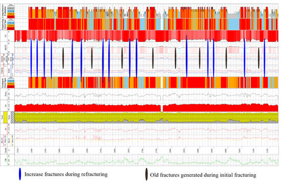 The remaining untapped reserves are primarily distributed between interwells, interfractures, and old fractures with insufficient modification [21]. To maximize the fracture-controlled reserves, geo-engineering integration is used to optimize the sweet spot, and then the reservoir is subdivided and cut. The evaluation model of the geological sweet spot of the reservoir was established using the physical parameters obtained from well logging data. The eighth track represents the classification result of the geological sweet spot (Figure 7). Similarly, the evaluation model of the engineering sweet spot of the reservoir was established using the elasticity parameters obtained from well logging data. The thirteenth track represents the classification result of the engineering sweet spot (Figure 7). By integrating the results of the geological sweet spot and engineering sweet spot, a comprehensive evaluation of the reservoir is conducted. The fourteenth track represents the classification result of the comprehensive classification (Figure 7). Based on the comprehensive evaluation of the sweet spot of geo-engineering integration, re-fracturing is performed on the old fractures with insufficient initial modification, and densification of the fractures is carried out between the old modification segments.