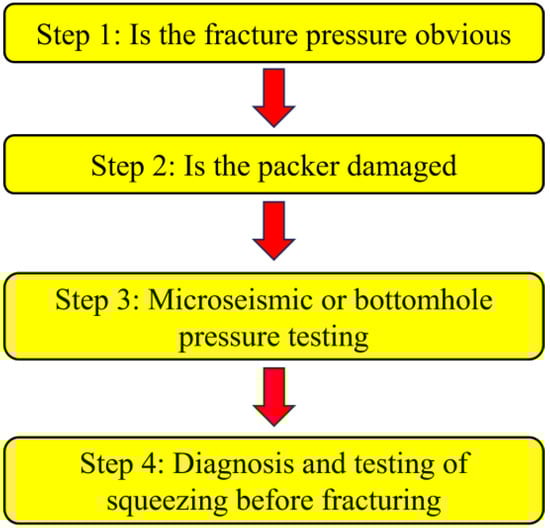 Among these methods, the re-fracturing of old fractures with insufficient initial modification requires an evaluation of the old fracture’s effectiveness. To address this, a “4-step method” is established to evaluate the effectiveness of old fractures in horizontal wells (Figure 8). The specific process is as follows: observe whether the fracture pressure is evident from the initial fracturing curve; check whether the downhole packer is damaged; test whether there is a discernible signal from the downhole microseismic test; and inject fracturing fluid at a small displacement before repeating the fracturing and observe whether the formation is noticeably supplied with fluids. When it is confirmed that the formation’s fracture pressure is not apparent, the packer is undamaged, the microseismic test does not exhibit a clear signal, and the formation does not have a significant fluid intake, which indicates that the old fracture modification is insufficient.