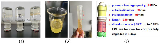 Research on key technologies of small casing cementing in horizontal wells: (a) high strength gel material; (b) annular sealing material; (c) dissolvable bridge plug for small casing.