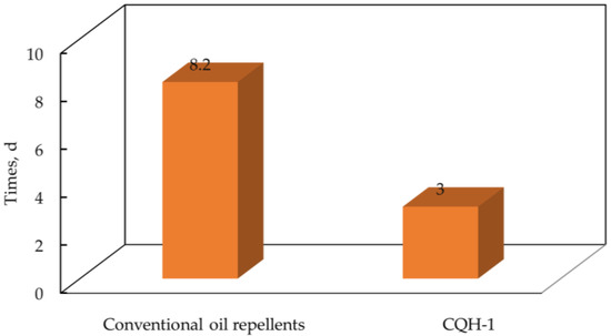 In addition, the newly developed fracturing and oil replacement agents, represented by CQH-1 (Figure 11), CQH-2, and CQH-3, are notable for their low interfacial tension properties and have been extensively utilized throughout the entire process [26]. Specifically, the interfacial tension of the novel fracturing and oil repellent agent CQH-1 is 10−3 mN/m. Furthermore, it exhibits an oil permeability replacement efficiency of 82.7%. As a result, the oil sighting cycle of the test wells was significantly reduced from 8.2 days to 3.0 days after the wells were put into production (Figure 12). After fracturing, the well is shut in for approximately 40–60 days to ensure permeability equilibrium before production is resumed.