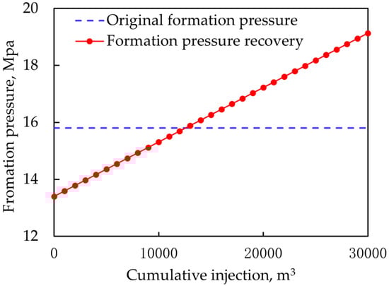 Relationship between cumulative injection volume and formation pressure of well CP52-11.