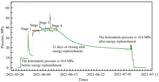 With the continued production of the old wells, the relatively rapid depletion of energy in the formation resulted in increased difficulty in stabilizing production, even though some measures were adopted [27]. To address this challenge, this study presents an innovative integrated energy replenishment strategy that encompasses pre-fracturing energy supplementation, fracturing energy enhancement, and post-fracturing energy supplementation. During the stage of pre-pressurization energy replenishment, 8000–10,000 m3 of fluid is injected into the horizontal wells, while 2000–3000 m3 is replenished into the directional wells. This intervention aims to restore formation pressure to over 95% of its original level. Subsequently, in the energy increase phase, rapid injection of fracturing fluid and high-pressure fluid elevates the pressure within the fracture–matrix system, thereby increasing the formation pressure to exceed 120% of its initial value. To illustrate the effectiveness of this approach, the CP52-11 horizontal well needs to be considered. When the cumulative volume of fracturing fluid reaches 8000 m3 during pre-fracturing energy supplementation, the formation pressure returns to 95% of its original level. Furthermore, upon reaching 20,000 m3 in the fracturing energy enhancement stage, the formation pressure rises to 121% (Figure 13). The final stage involves post-fracturing energy supplementation, during which formation pressure redistributes, and oil and water undergo complete exchange. For instance, the well QP22, with a horizontal section length of 744 m, has a cumulative replenishment of 10,000 m3 of energy before repetitive fracturing, and then the formation pressure level rises from 63.2% to 103.8% (Figure 14). After repeated fracturing, the well is shut in for 21 days, the pressure dissipates fully, the formation pressure redistributes, and the oil and water are replaced fully. After an additional 21 days of shut in, the seepage absorption reaches equilibrium, and the pressure change is no longer noticeable.