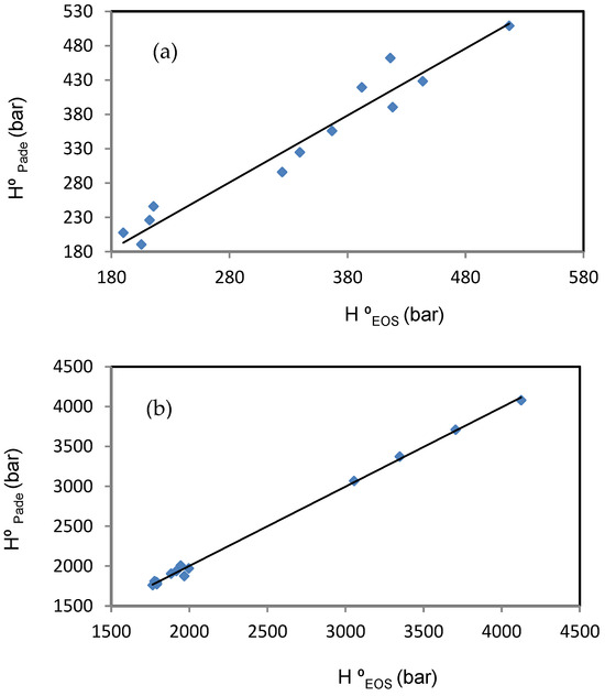 The Henry’s constants for the twelve mixtures calculated from the equation of state (EOS) and those estimated from the Padé equations presented in Table 7 (Padé) are plotted in Figure 1. In this figure, dots are experimental data and lines are calculated values.