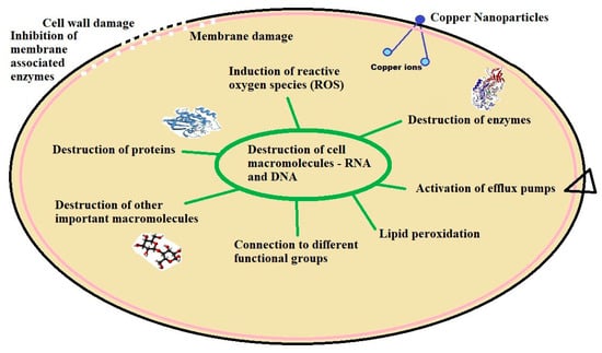 - Ramos-Zúñiga, J.; Bruna, N.; Pérez-Donoso, J.M. Toxicity mechanisms of copper nanoparticles and copper surfaces on bacterial cells and viruses. Int. J. Mol. Sci. 2023, 24, 10503. [Google Scholar] [CrossRef] [PubMed]