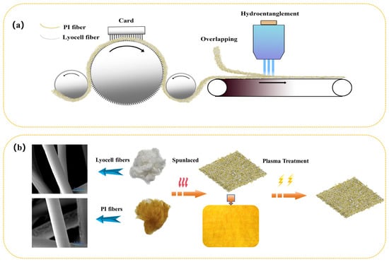 Schematic diagram of the preparation of PI/lyocell composite spunlace nonwoven fabric: (a) hydroentanglement process schematic and (b) plasma processing 5-P process diagram.