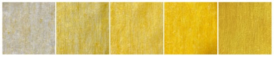The plasma treatment on 5-P was carried out with a PSPT-2000C Atmospheric Pressure Glow Discharge Plasma Machine (Nanjing Presepe Electronic Technology Co., Ltd., Nanjing, China), air employed as both the carrier and reactive gases, operating under standard temperature (25 °C) and pressure conditions (101 kPa). Samples were placed on a quartz glass plate, with the treatment height set to 2 mm, the electrode moved at a speed of 40 mm/s, and exposed for 120 s at 60 W, 90 W, 120 W, and 150 W, respectively. The treated fabrics were stored for 24 h under standard circumstances (21 ± 1 °C, 65 ± 2% humidity) before being evaluated further.