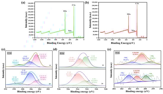 (a) XPS spectra of raw 5-P, (b) XPS spectra of plasma treatment 5-P, (c–e) C1s, N1s, and O1s spectra of 5-P before and after plasma treatment with deconvoluted peaks.