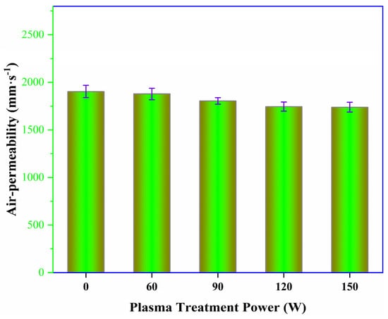 Air permeability is an important indicator of hygienic materials, which affects the comfort of hygienic skin-fitting materials. The air permeability of 5-P was characterized at different plasma treatment powers and the results are shown in Figure 6.