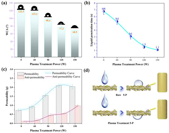 Effect of different plasma treatment power on (a) WCA, (b) liquid penetration time, and (c) permeability performance; (d) schematic of water conductivity of 5-P before and after plasma treatment.