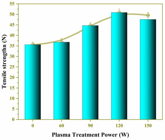 The mechanical properties of 5-P were tested, and the results are shown in Figure 8. The tensile strength increased slightly from initial 36.5 N to 50.9 N. This was attributed to the increased roughness of the fiber surface after plasma treatment. The original two fibers hydroentangled formed a stable 3D structure. The increased fiber roughness reduced the slip effect and enhanced the inter-fiber adhesion [38]. As a result, the tensile strength of the nonwoven fabric was enhanced. As the processing power was increased to 120 W, the ion etching on the fiber surface reached its peak. Under continued increase in power, the tensile properties no longer changed significantly.