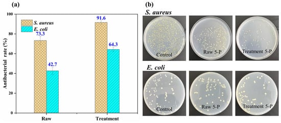 The antimicrobial activity of 5-P is shown in Figure 9a,b. It can be seen that raw 5-P exhibited 73.3% and 42.7% bacterial inhibition against S. aureus and E. coli, indicating that PI fiber has an effective antimicrobial effect. After being plasma-treated, 5-P exhibited 91.57% and 64.3% against S. aureus and E. coli, respectively. As compared to untreated samples, the antimicrobial rate increased by 24.9% and 50.6% against the two species of bacteria.