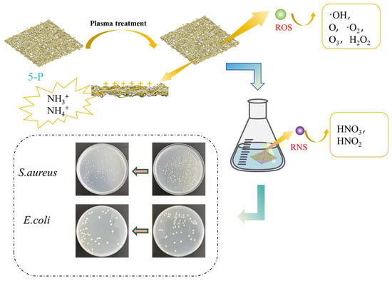 This is possibly due to the production of positively charged substances on the surface of the nonwoven fabrics under the action of plasma, as shown in Figure 10. More N-containing groups with antimicrobial properties were generated and exposed on the fiber surface, as can be seen in Figure 5d. After plasma treatment, NH3+ and NH4+ on the fiber surface increased by 37.0% and 131.8%, respectively. Meanwhile, under the action of high-energy particles, free locally reactive oxygen and locally reactive nitrogen can be generated on the fiber surface [39], including the atoms O, O3, H2O2 and the N atoms NO, NO2, and their derivatives.