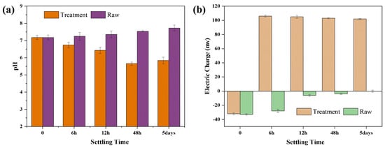 Charge (a) and Ph (b) of raw and plasma-treated 5-P in deionized water at different times.