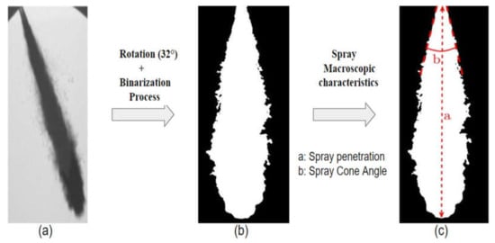 Image processing for diesel spray analysis. (a) Raw image. (b) Binarizing the image. (c) Macroscopic spray parameters.