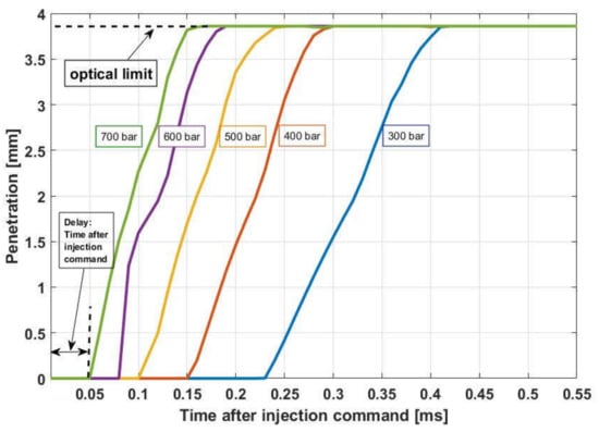 The main focus of this study was to investigate the behavior of a diesel spray under varying injection pressures. In this experiment, the injection duration was maintained at 0.55 ms. We recorded a delay after the start of injection, which varied depending on the injection pressure: 0.23 ms at 300 bar, 0.15 ms at 400 bar, 0.065 ms at 600 bar, and 0.05 ms at 700 bar.