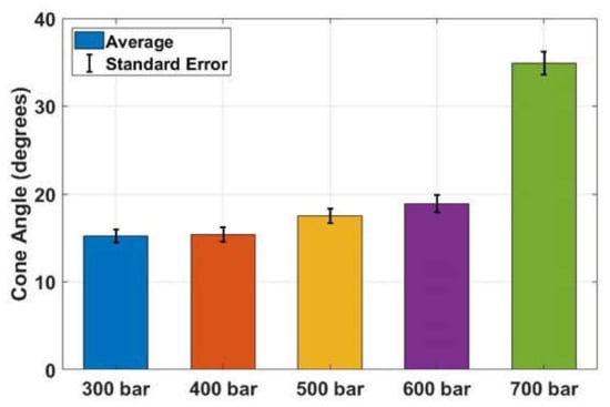 Figure 5 illustrates the spray cone angle at various injection pressures. A closer look at the figure indicates that as the injection pressure increases from 300 bar to 600 bar, the spray cone angle increases from 15° to 19°, indicating a rise of 26.7%. The findings show a narrower cone angle at the start of the injection, due to viscosity, and as we move towards the end of the injection, the cone angle widens [31]. This is attributed to various factors such as needle movement, shearing forces, turbulence within the spray, droplet collisions, and coalescence caused by injection pressures. This pattern of results is consistent with previous research [32]. At the transient stage, the cone angle is observed to be wider compared to the quasi-steady period. This is because of the needle’s low lift, which throttles the fuel flow from the needle seat to the orifice. It should be underlined that the configuration of the injector also affects the spray cone angle. The research of Ahmed et al. [33] observed that when the number of ports was reduced from six to two, the cone angle tended to widen. As a final remark, it is also vital to mention that changes in injection pressures between 300 and 400 bar do not significantly affect the cone angle. However, when increasing from 600 to 700 bar, a wider spray cone angle is observed, which can lead to increased air entrainment into the jet, consequently shortening the spray penetration.