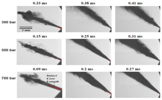 This section will point to the temporal evolution of the intact core length under different injection pressures. The red area in Figure 6 represents the unperturbed intermittent region within the spray. Figure 7 illustrates the development of the intact core length under varying injection pressures. The results indicate that at low injection pressures (300 to 500 bar), the intact core length increases by 0.3 mm. At higher injection pressures (500 to 700 bar), the core length increases by 0.14 mm. One interpretation of these findings is that at higher injection pressures, the core region approaches the initial axial velocity of the jet, as given by [36]: