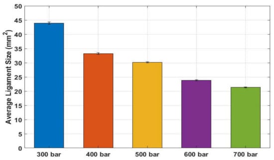 Ligament distributions were observed at the end of injection for different injection pressures, as depicted in Figure 9. The smallest ligament size was obtained at the highest pressure (700 bar), at approximately 22 . This result is attributed to the enhanced spray atomization and air entrainments [45]. A higher injection pressure promotes the breakup of ligaments into droplets due to the combined effect of capillarity and hydrodynamics [46,47]. Additionally, ligaments are significantly affected by spray shape. As the spray moves downstream, disturbances occur, velocity decreases due to drag and shear forces, causing the spray to lose its spheroid shape and form ligaments [48]. In addition, at the end of injection, careful observation reveals that swirling flows are generated inside the orifices due to the needle valve’s eccentric movement, which leads to the fragmentation of the fuel liquid into ligaments [49].