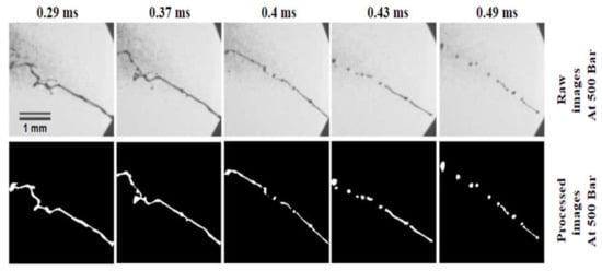 At each injection pressure, 500 images were captured to collect information about liquid structures. A total of 2500 images were processed with the MATLAB toolbox. The first step in image processing was to apply background subtraction to isolate the spray from its background. Then, we binarized the resulting images using a threshold to create a binary mask, assigning pixel values of 0 for black and 255 for white. Figure 2 defines two key spray characteristics: spray tip penetration and cone angle. Spray tip penetration is defined as the distance from the spray nozzle to the farthest point of the spray boundary. This distance was calculated using the Euclidean distance formula. The cone angle is represented as the angle formed between two tangential lines at the nozzle spray boundary (illustrated by the red lines in Figure 3c). The MATLAB 2022b functions ‘imfindcircles’ and ‘regionprops’ were used for microscopic analysis to detect droplets and find their average sizes. It is important to note that the measurement techniques used were a combination of functions that detect the center and the size of the droplet. Furthermore, ligaments (elongated liquid structures) were also measured using boundary detection techniques to measure their size accurately.